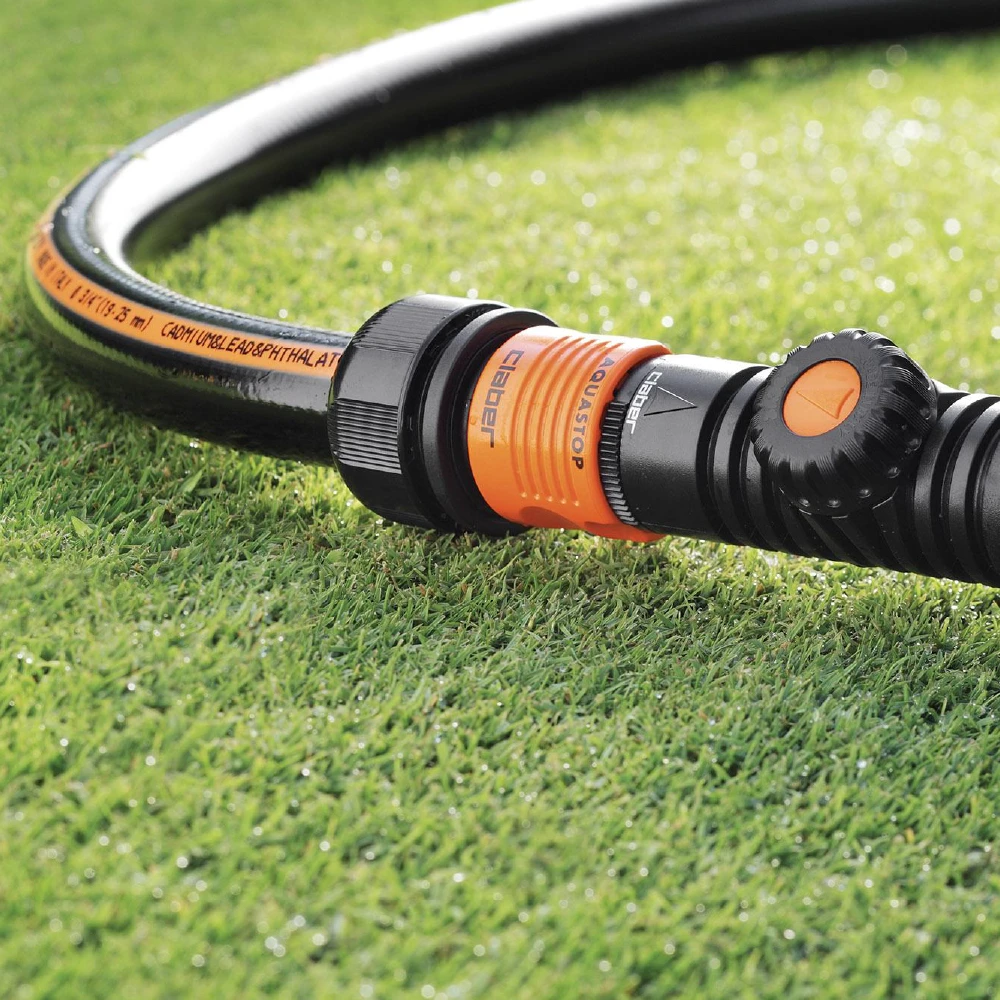 Automatski priključak za 3/4′ (unutarnji promjer 1 mm; vanjski 25 mm) crijeva s aquastop ventilom. Protok vode se prekida odvajanjem muškog dijela.