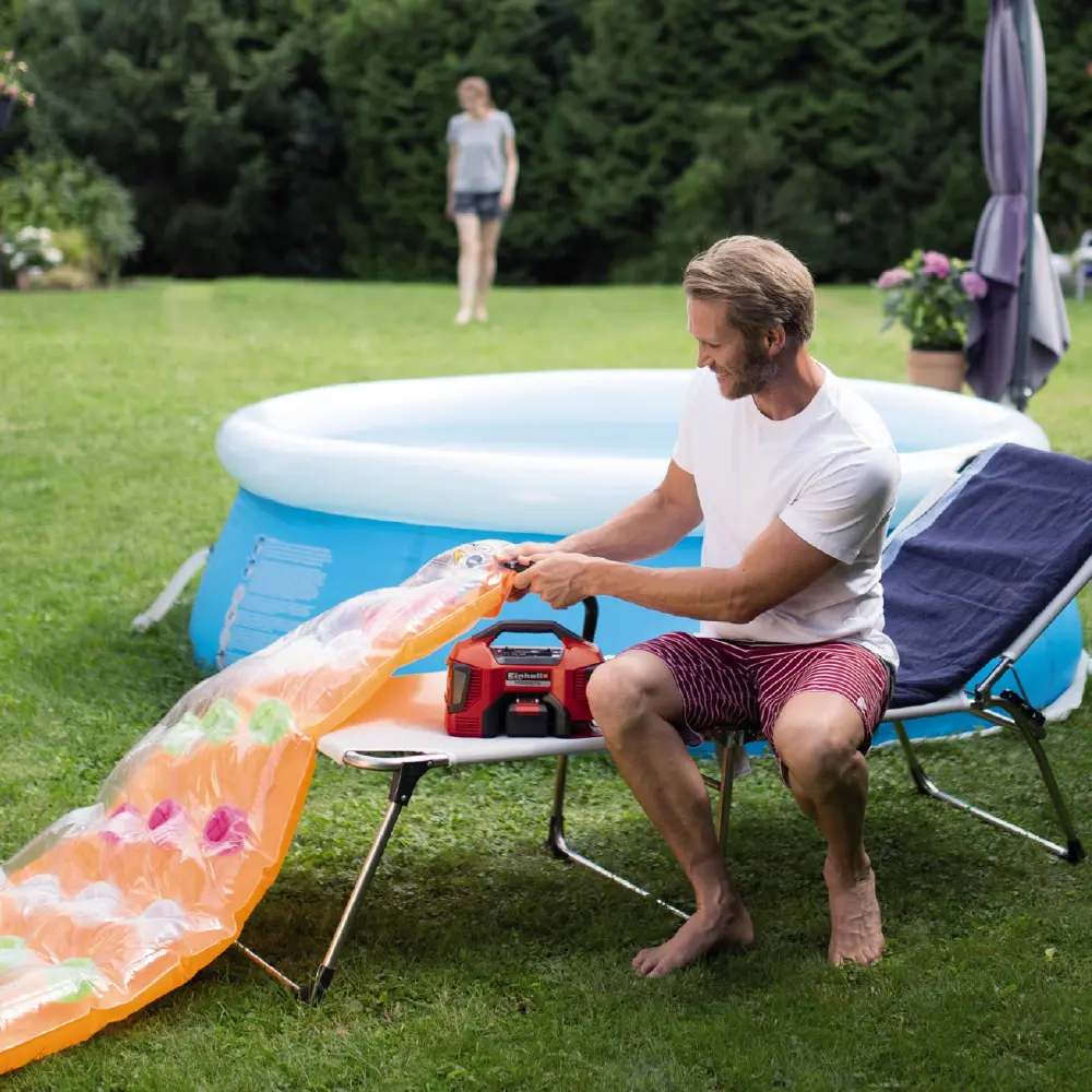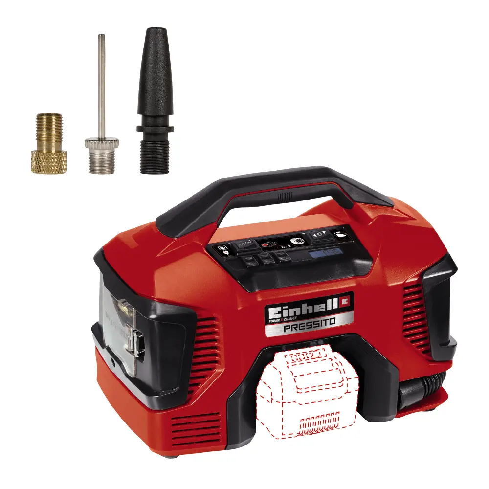 Einhell akumulatorski hibridni kompresor PRESSITO je višenamjenski kompresor s visokotlačnim i niskotlačnim pumpama te opcijom niskotlačnog usisavanja. Praktičnim aku hibridnim kompresorom može se upravljati pomoću strujnoga kabela ili baterije od 18 V visokih performansi iz Power X-Change sistema (6u1-funkcija). PRESSITO s visokotlačnom pumpom za pumpanje zraka u gume za automobile i bicikle nije samo savršen dodatak za garažu, već je idealan i za korištenje na cesti. I za sport, kompresor je također praktičan pomoćnik za napuhavanje lopti točno tamo gdje je akcija ili za posljednju provjeru guma prije velike biciklističke ture. Visokotlačna pumpa ima maksimalni radni tlak od 11 bara i korisnik je može ručno podesiti. Funkcija automatskog isključivanja osigurava da se kompresor zaustavi kada se postigne podešeni tlak. Niskotlačna pumpa omogućuje napuhavanje zračnih madraca ili gumenih čamaca za kratko vrijeme, a niskotlačna usisna funkcija pomaže u brzom ispuhavanju. Prebacivanje između visokotlačnih i niskotlačnih funkcija odabire se tipkom. Uključen je i 3-dijelni set za napuhavanje s adapterima za automobilske i biciklističke gume, za nogometne i košarkaške lopte te za zračne madrace i gumene čamce. Kabeli i crijeva za aku hibridni kompresor nalaze se izravno na samom alatu, tako da ne mogu smetati niti se izgubiti. Na kućištu također postoji mjesto za set za napuhavanje. Au hibridni kompresor ima digitalni zaslon s indikatorom tlaka, a ručne kontrole su jednostavne za korištenje. Kompaktni i lagani aku hibridni kompresor može se lako pospremiti, a zahvaljujući bateriji i praktičnoj ručki za nošenje može se nositi i sa sobom u automobilu. Prednosti bežičnog alata su očite: s novom generacijom snažnih i dugotrajnih baterija tvrtke Einhell, višenamjenski kompresor nudi i pogodnost mobilne uporabe. Baterije s visokovrijednim litij-ionskim ćelijama također se mogu koristiti za sve članove obitelji Power X-Change, kako za vrt tako i za segment alata. Punjive baterije i punjači za asortiman proizvoda Power X-Change dostupni su zasebno.