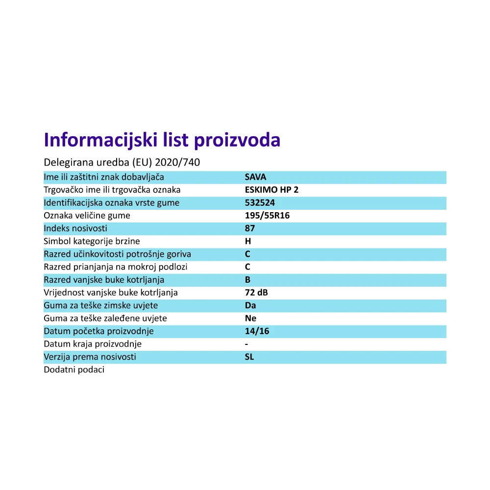 Guma 195/55R16 87H Eskimo HP 2 MS TL SAVA