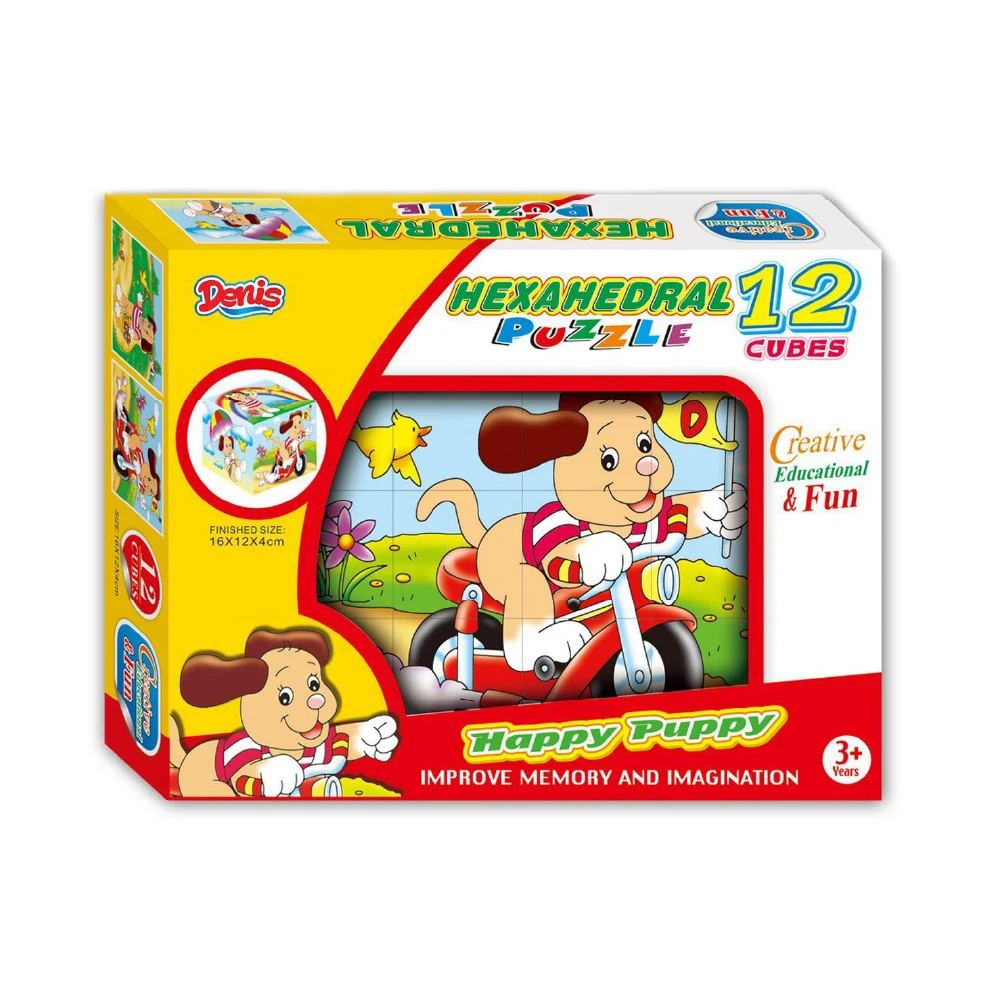 Zabavna i šarena slagalica s motivom veselog štenca. Sadrži 12 kocaka i 6 različitih slika za slaganje, idealna za razvoj fine motorike i logičkog razmišljanja kod djece.